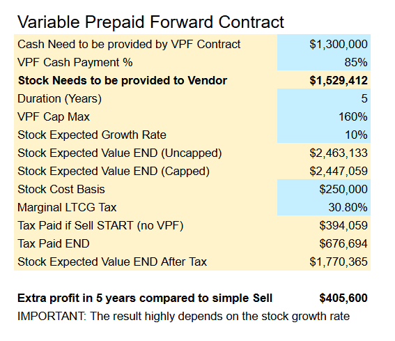 VPF contracts typically use a collar strategy that sets a floor of 80% and a cap of 160%. This means the stock will be effectively sold at the 160% cap, or $2.44M. Assuming the marginal tax rate remains the same at 30.8%, the tax paid after 5 years would be $676K.